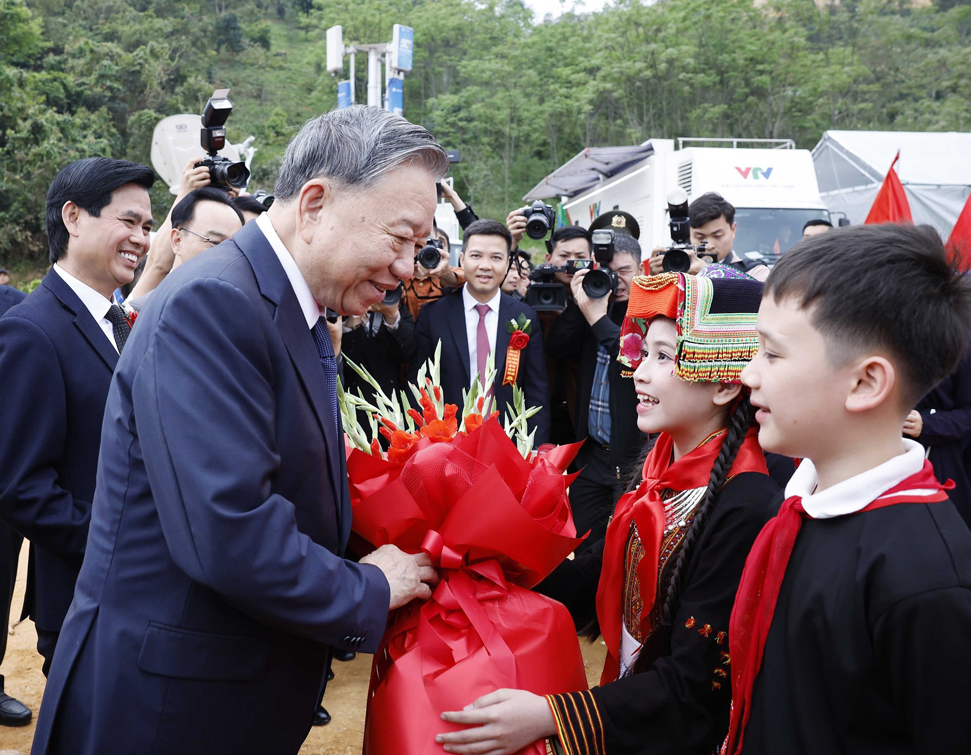 Thiếu nhi dân tộc tỉnh Lạng Sơn chào đón Tổng Bí thư Tô Lâm tới dự lễ khởi công, động thổ đồng loạt các trường nội trú liên cấp biên giới. Ảnh: TTXVN