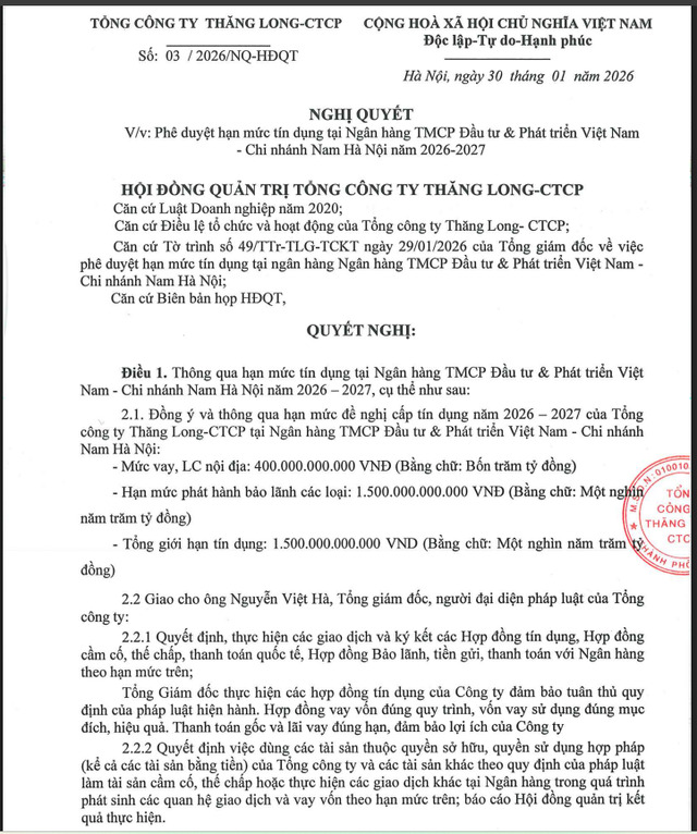 Theo Nghị quyết của Hội đồng quản trị vừa được Tổng Công tyThăng Long- CTCP công bố cho thấy, doanh nghiệp đã phê duyệt hạn mức tín dụng tạiNgân hàng TMCP Đầu tư và Phát triển Việt Nam (BIDV)- Chi nhánh Nam Hà Nội năm2026-2027.