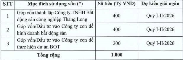 Thời gian dự kiến chào bán từ quý I/2026 - quý II/2026, saukhi có thông báo chấp thuận của Ủy ban Chứng khoán Nhà nước (UBCKNN). Nếu đợtchào bán thành công, vốn điều lệ của Tổng Công ty Thăng Long sẽ tăng từ 419,08tỷ đồng lên 1.419,08 tỷ đồng.