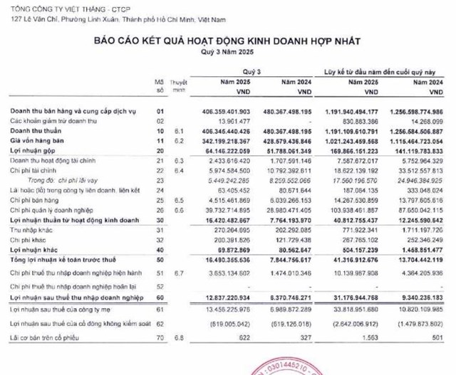 Tổng Công ty Việt Thắng - CTCP (mã ck: TVT) vừa công bố báo cáo kinh doanh quý III/2025 và 9 tháng đầu năm.