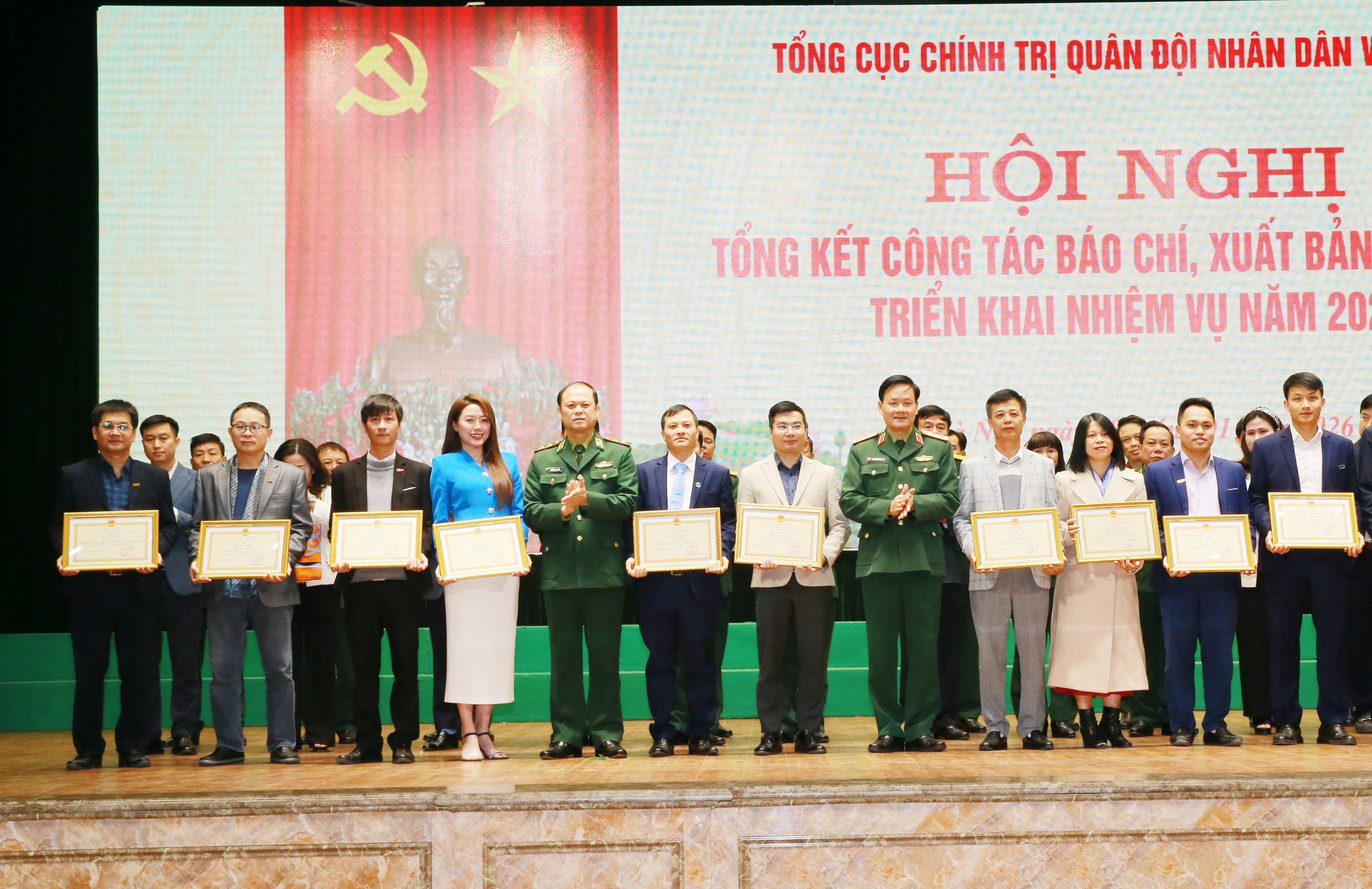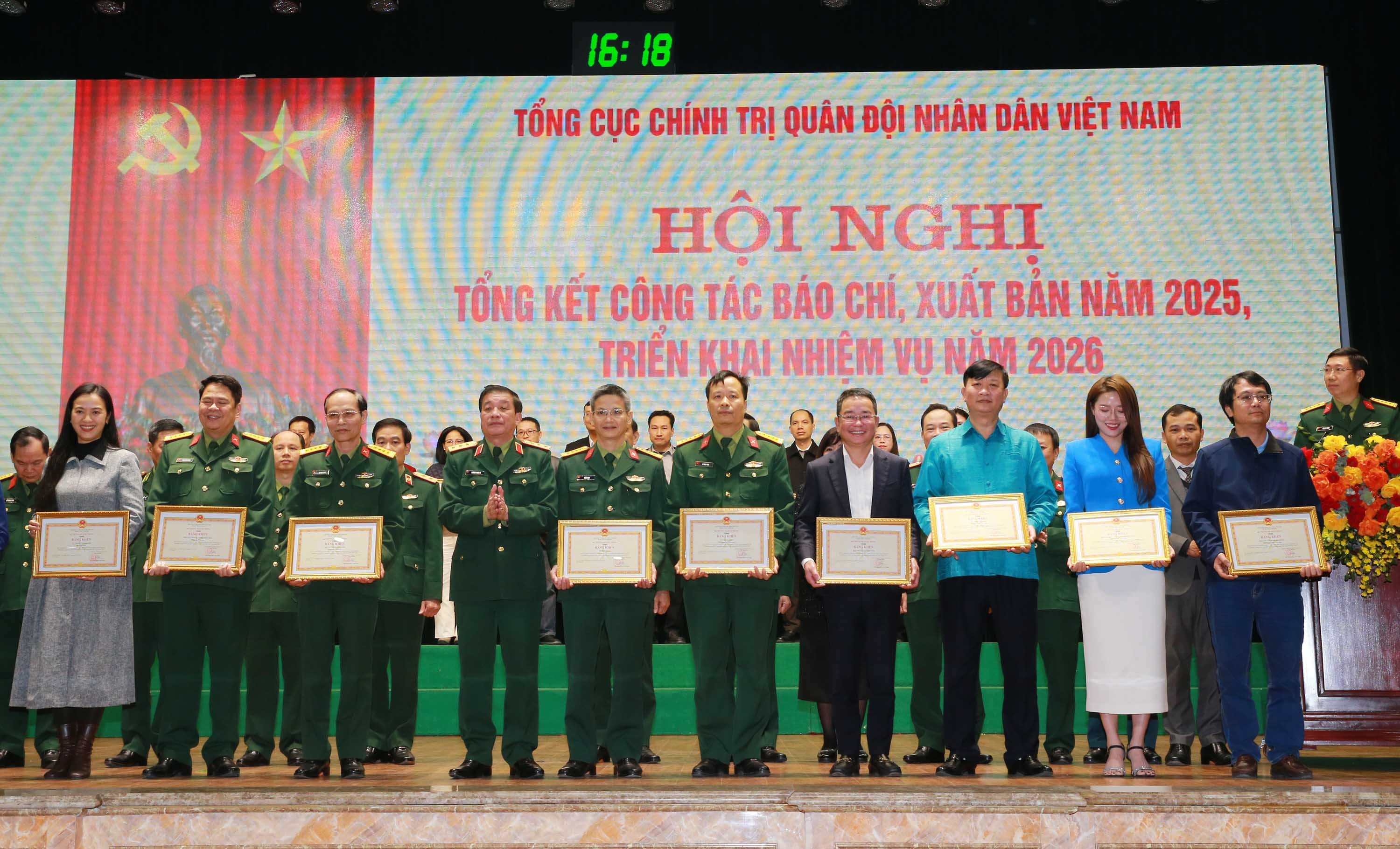 Các tập thể và cá nhân được trao tặng Bằng khen của Tổng Cục Chính trị Quân đội nhân dân Việt Nam đã có thành tích tiêu biểu trong công tác báo chí, xuất bản năm 2025. Ảnh: Trọng Đức