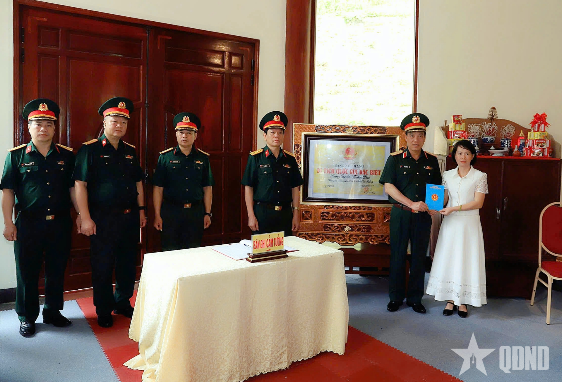 Thiếu tướng Vũ Văn Cường trao quà của Quân ủy Trung ương, Bộ Quốc phòng và Tổng cục Hậu cần - Kỹ thuật tặng Ban Quản lý Khu di tích Quốc gia đặc biệt rừng Trần Hưng Đạo.