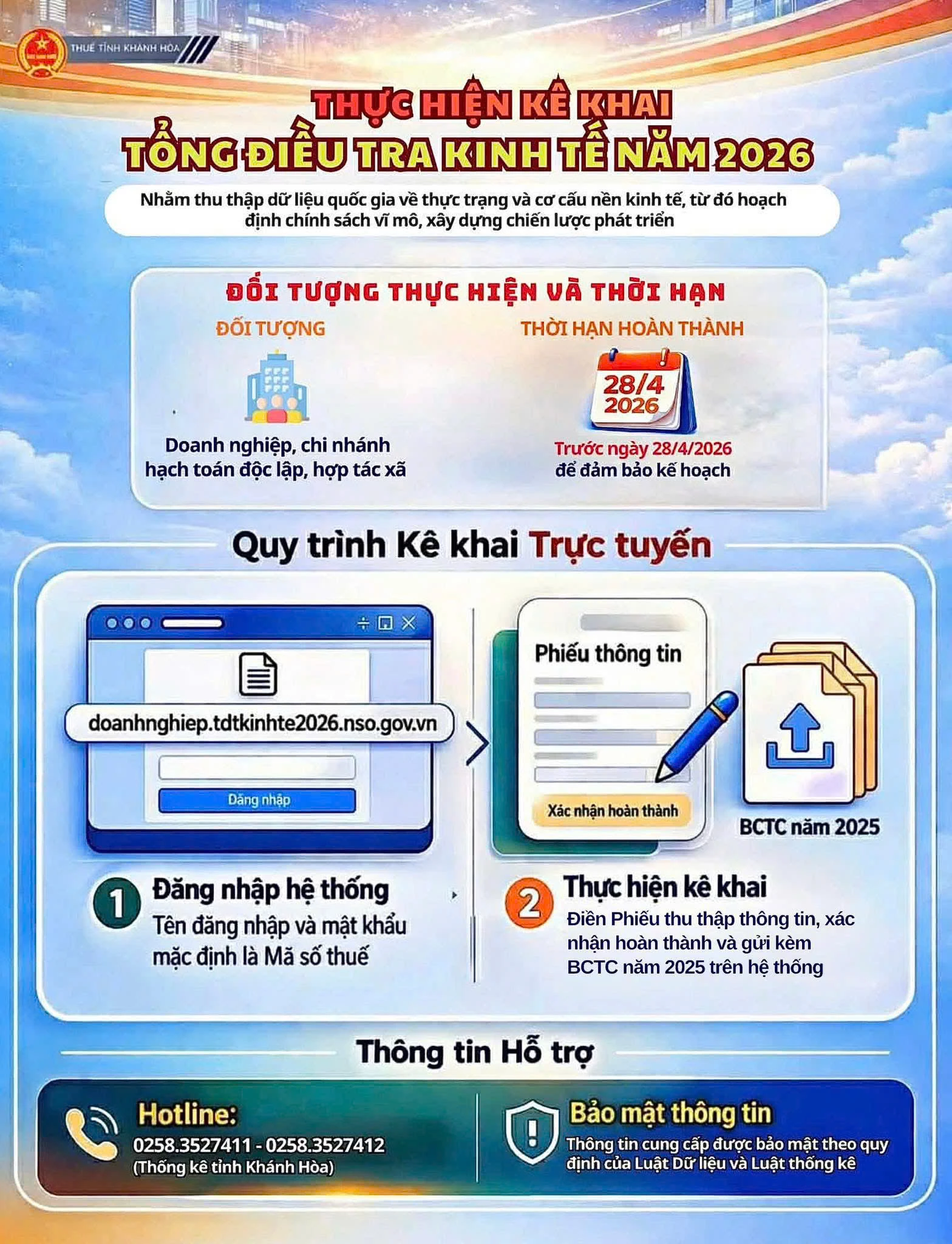Thuế tỉnh Khánh Hòa vừa có thông báo gửi các DN và đăng trên website của Thuế tỉnh về việc thực hiện kê khai Tổng điều tra kinh tế năm 2026. Trong đó nhấn mạnh “việc kê khai phiếu là yêu cầu bắt buộc đối với các DN, chi nhánh hạch toán độc lập và hợp tác xã. Đây là nhiệm vụ rất quan trọng để Nhà nước có dữ liệu đầy đủ về thực trạng, cơ cấu nền kinh tế, từ đó hoạch định chính sách vĩ mô, xây dựng chiến lược phát triển”. Bà Nguyễn Kim Thái Linh - Phó Trưởng Thuế tỉnh cho biết, để bảo đảm Tổng điều tra kinh tế năm 2026 (giai đoạn 2) trên địa bàn tỉnh được triển khai đúng tiến độ, đầy đủ và đạt chất lượng, Thuế tỉnh đề nghị các DN khẩn trương thực hiện kê khai phiếu thu thập thông tin trực tuyến, hoàn thành trước ngày 28-4. Thông tin DN cung cấp được bảo mật theo quy định của pháp luật về bảo vệ dữ liệu cá nhân và thống kê.