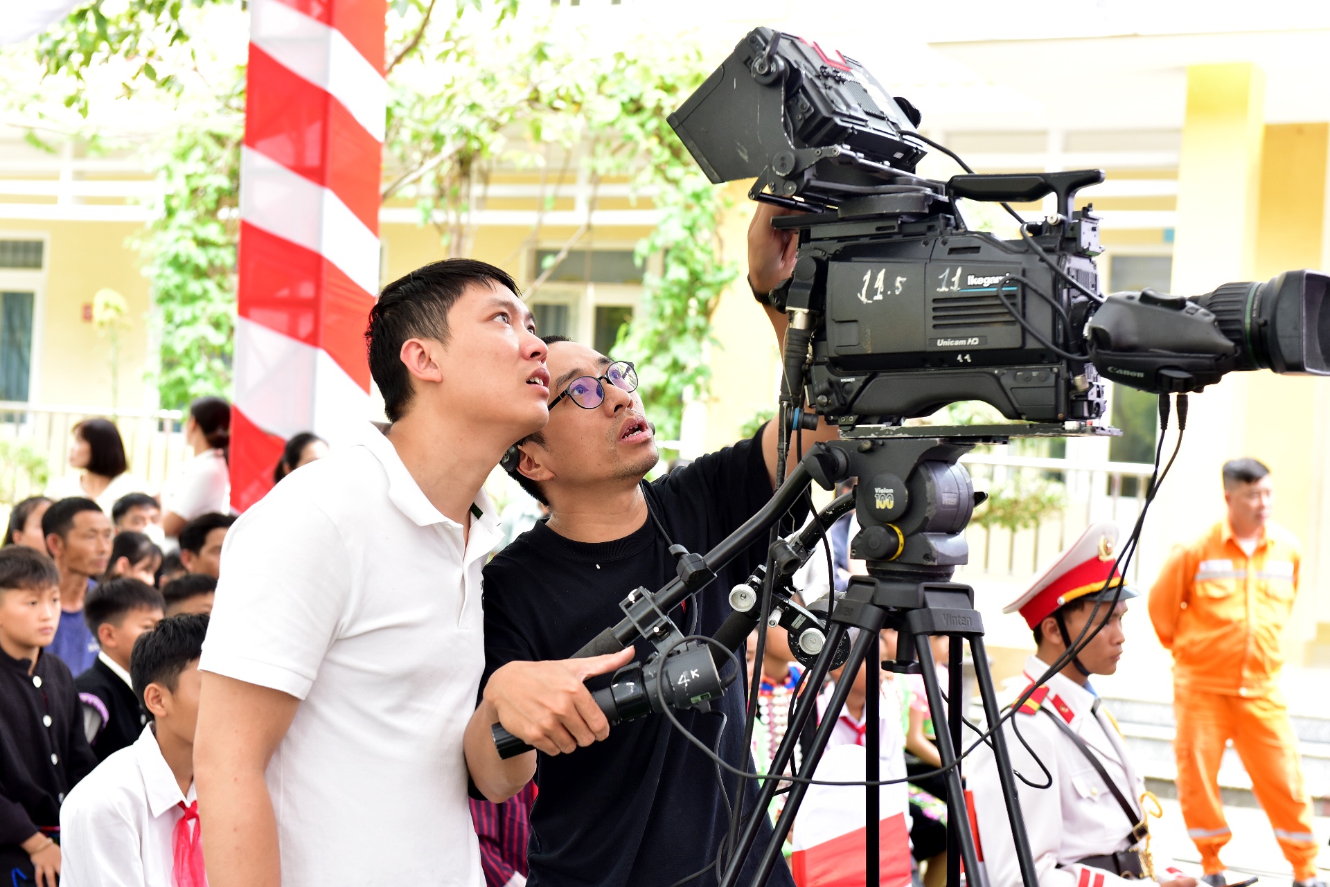 Đội ngũ phóng viên Báo và Phát thanh, truyền hình tỉnh và VTV chuẩn bị máy quay cho cầu truyền hình trực tiếp.