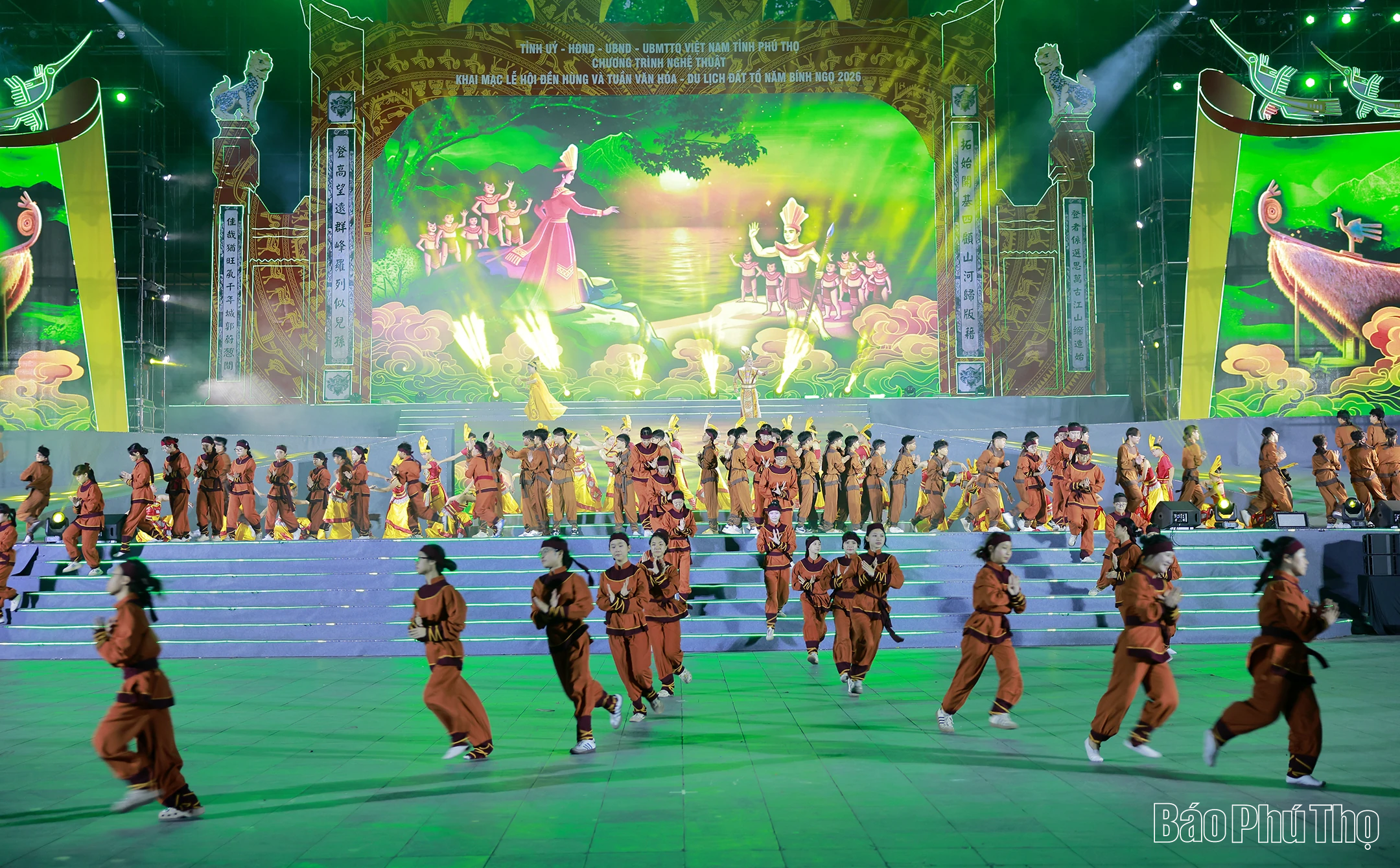 Chương trình nghệ thuật Khai mạc Lễ hội Đền Hùng và Tuần Văn hóa - Du lịch Đất Tổ năm Bính Ngọ 2026 mang chủ đề “Linh thiêng nguồn cội - Đất Tổ Hùng Vương” được dàn dựng công phu với sự kết hợp hài hòa giữa yếu tố truyền thống và hiện đại. Nội dung chương trình tái hiện đậm nét giá trị lịch sử, văn hóa thời đại Hùng Vương, tôn vinh đạo lý “Uống nước nhớ nguồn”, đồng thời lan tỏa hình ảnh quê hương Đất Tổ giàu truyền thống, đang phát triển năng động, hội nhập.