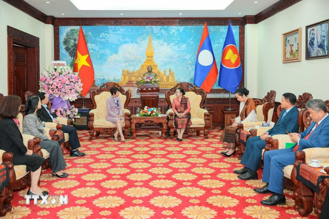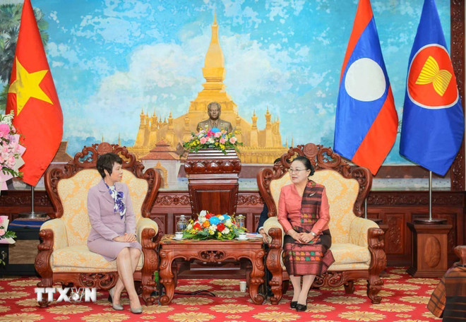 Tổng Giám đốc Vũ Việt Trang và Đại sứ Lào tại Việt Nam Khamphao Ernthavanh. (Ảnh: Hoàng Hiếu/TTXVN)