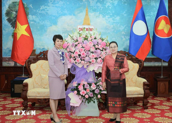 Đoàn đại biểu Thông tấn xã Việt Nam do Tổng Giám đốc Vũ Việt Trang làm trưởng đoàn chúc mừng Đại sứ quán nước Cộng hòa Dân chủ Nhân dân Lào tại Việt Nam. (Ảnh: Hoàng Hiếu/TTXVN)
