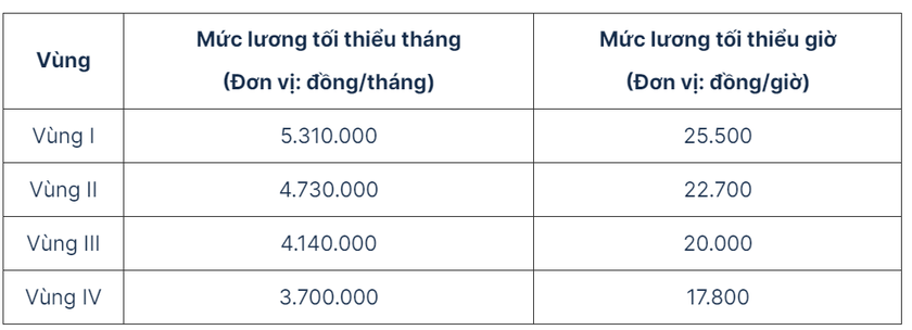 Theo Nghị định 293/2025/NĐ-CP, mức lương tối thiểu tháng tại 4 vùng được quy định như sau: Vùng I: tăng 350.000 đồng, từ 4.960.000 đồng/tháng lên 5.310.000 đồng/tháng; Vùng II: tăng 320.000 đồng, từ 4.410.000 đồng/tháng lên 4.730.000 đồng/tháng; Vùng III: tăng 280.000 đồng từ 3.860 đồng/tháng lên 4.140.000 đồng/tháng; Vùng IV: tăng 250.000 đồng từ 3.450.000 đồng/tháng lên 3.700.000 đồng/tháng.