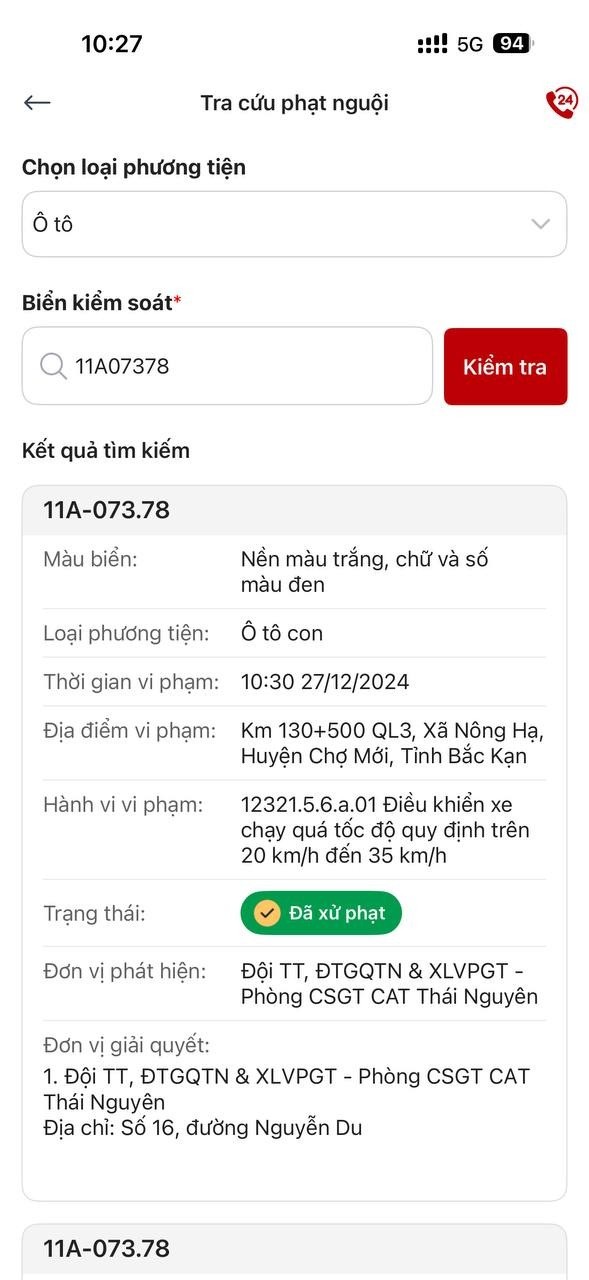 Biển số xe: 11A07378 - Chủ phương tiện đã tiến hành nộp phạt