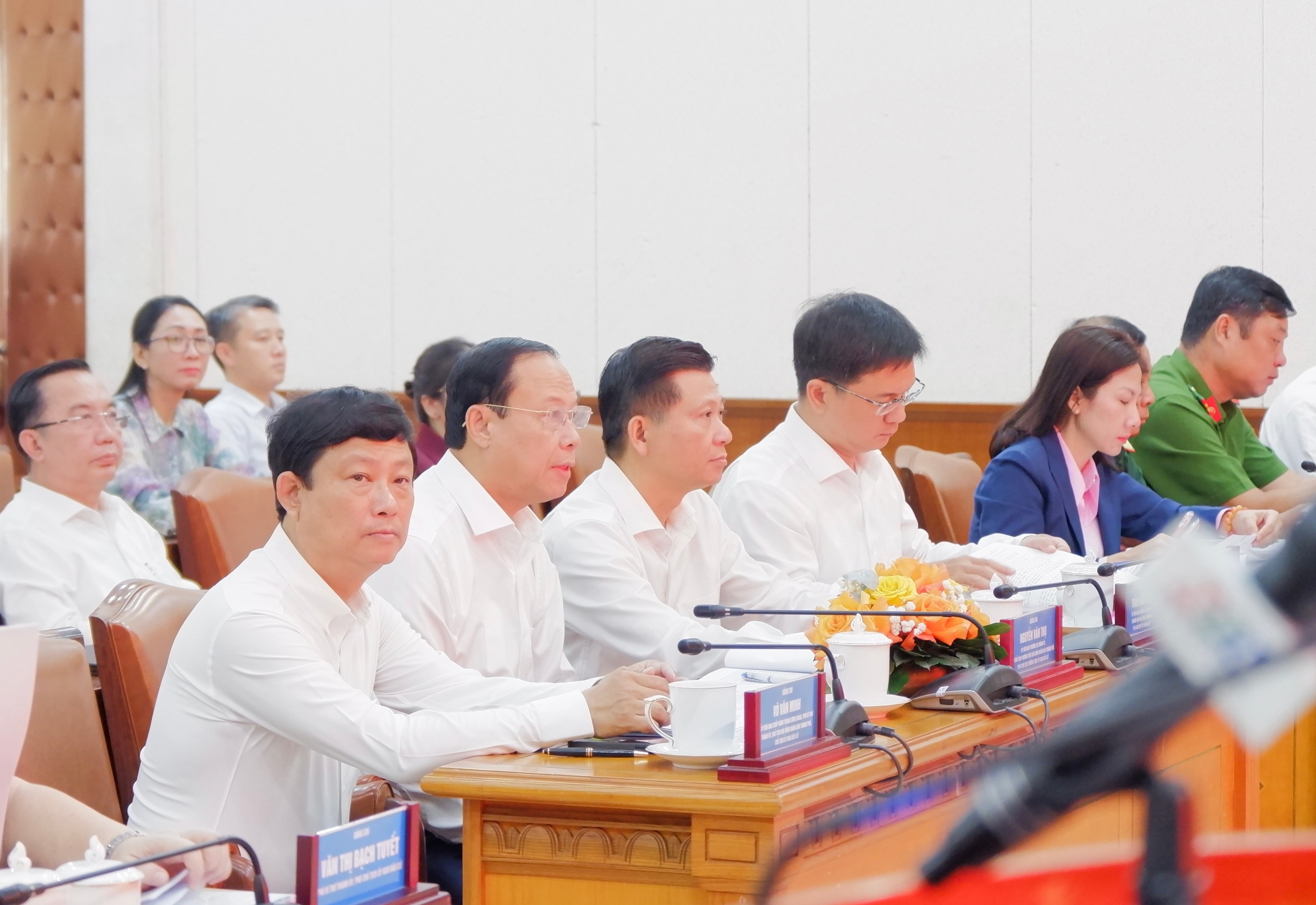Phó Bí thư Thành ủy, Chủ tịch HĐND, Chủ tịch Ủy ban Bầu cử thành phố Võ Văn Minh cùng các đại biểu dự hội nghị. Ảnh: Hoa Lê