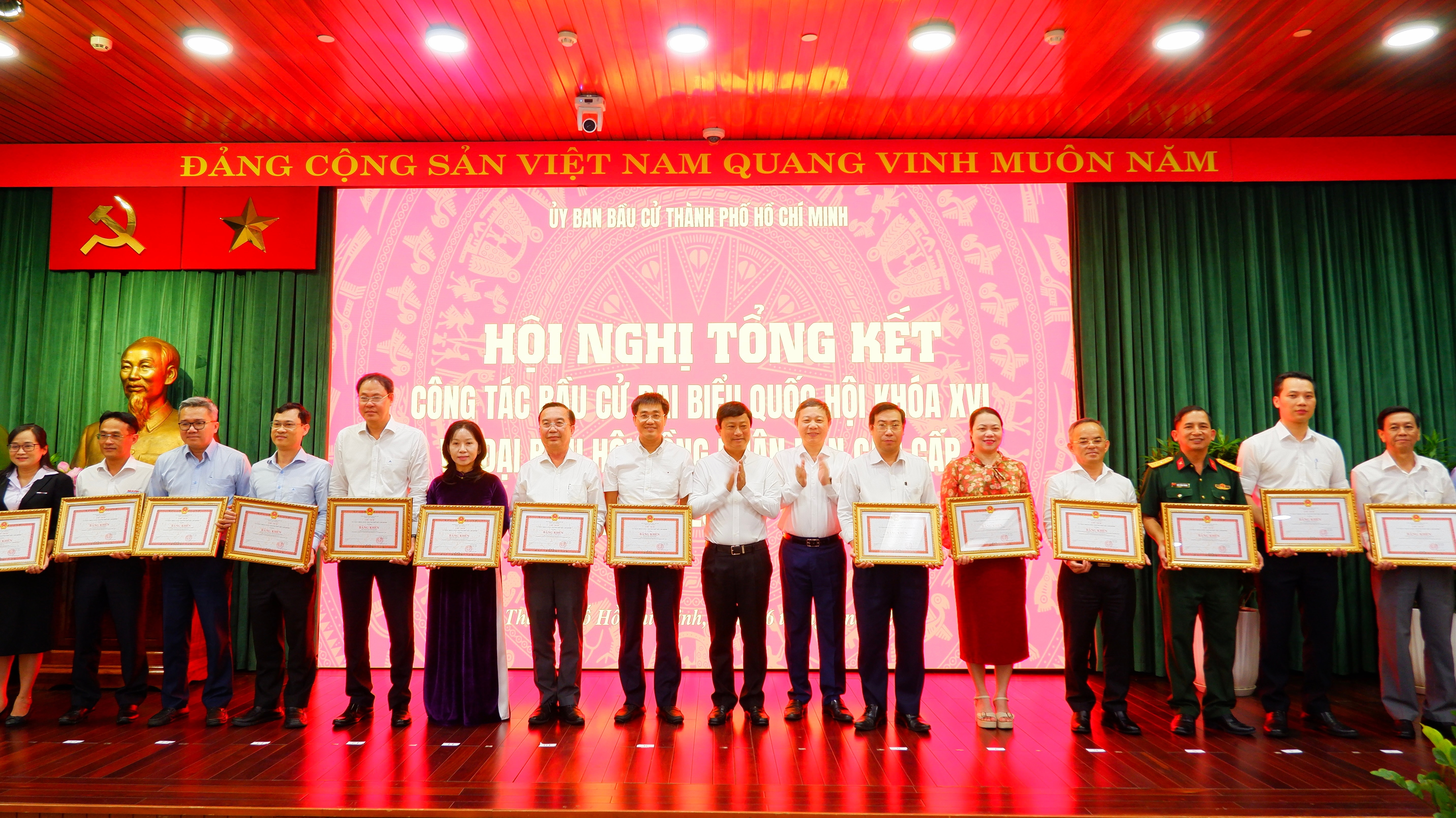 Chủ tịch HĐND TP. Hồ Chí Minh Võ Văn Minh trao Bằng khen của Chủ tịch UBND thành phố cho các tập thể có thành tích xuất sắc trong công tác bầu cử. Ảnh: Hoa Lê
