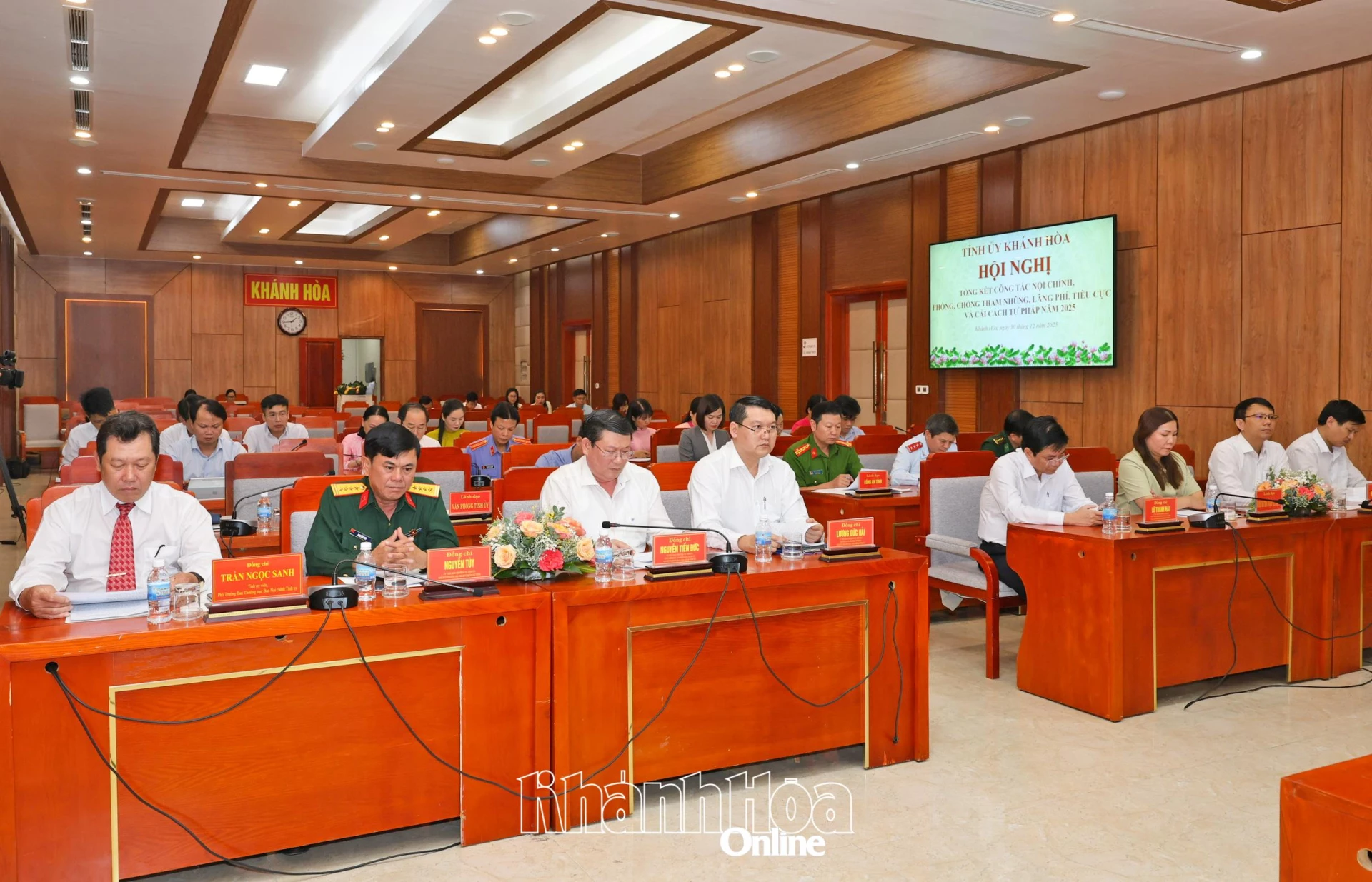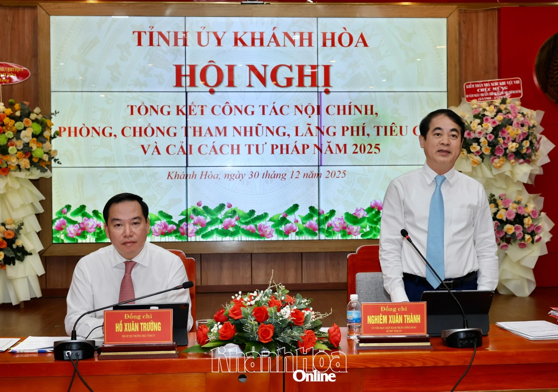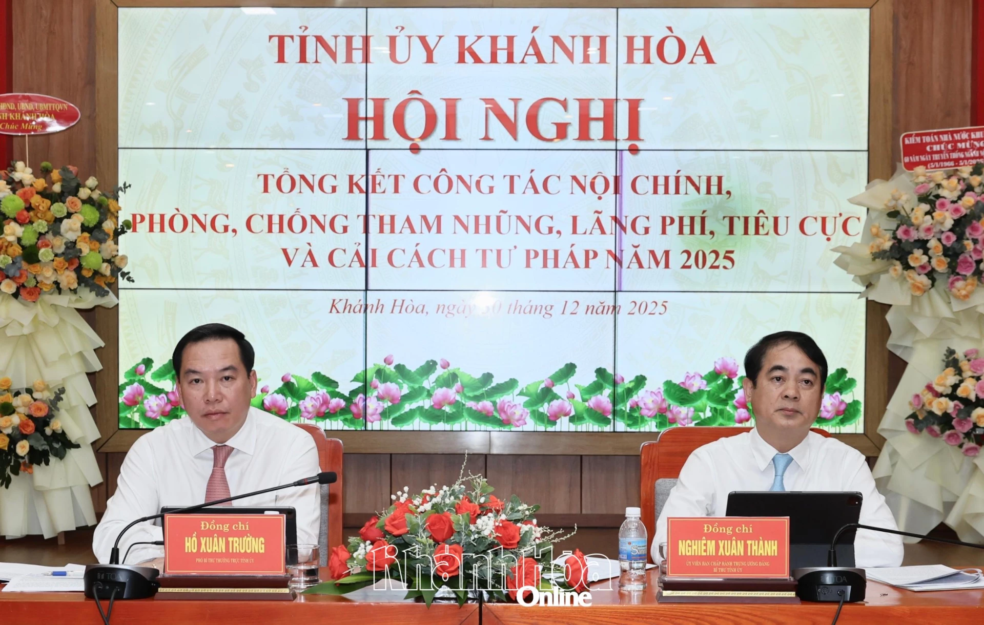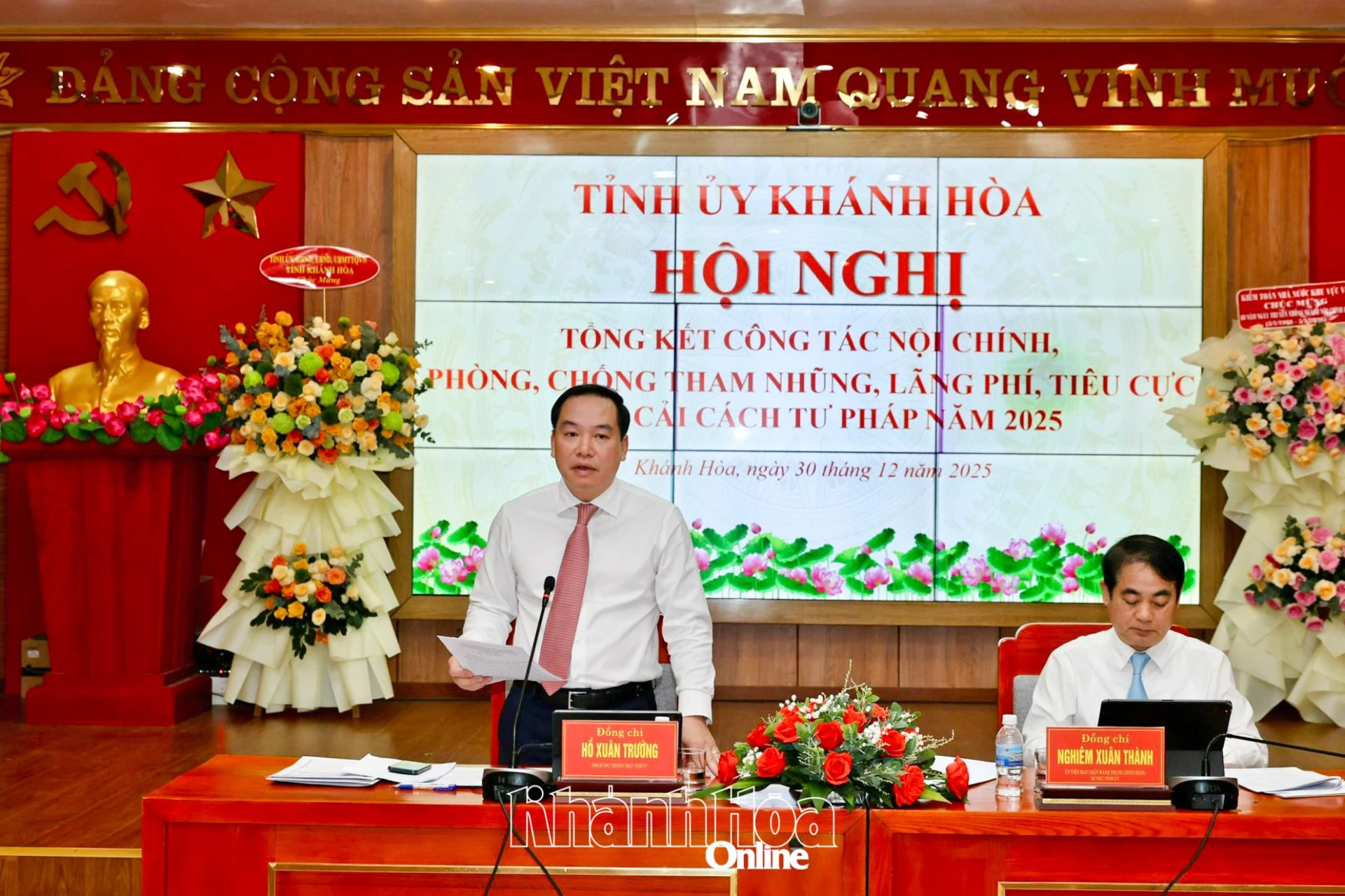 Chiều 30-12, các đồng chí: Nghiêm Xuân Thành - Ủy viên Trung ương Đảng, Bí thư Tỉnh ủy Khánh Hòa; Hồ Xuân Trường - Phó Bí thư Thường trực Tỉnh ủy chủ trì Hội nghị tổng kết công tác nội chính, phòng, chống tham nhũng (PCTN), lãng phí, tiêu cực và cải cách tư pháp (CCTP) năm 2025. Dự hội nghị có các đồng chí Ủy viên Ban Thường vụ Tỉnh ủy, Thường trực HĐND, lãnh đạo UBND, Ủy ban MTTQ Việt Nam tỉnh.