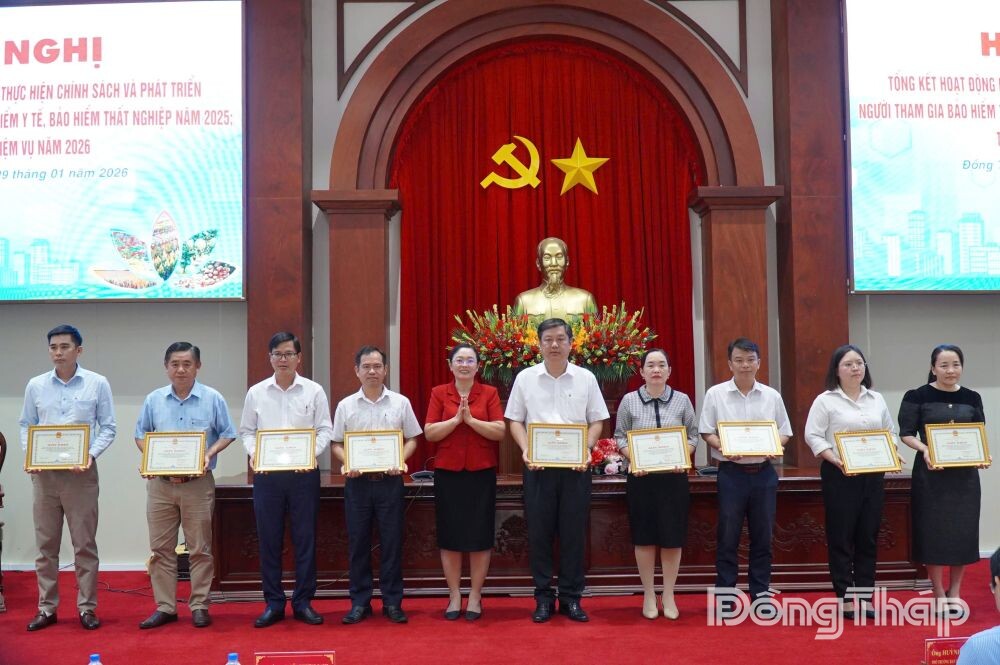 Dịp này, BHXH tỉnh Đồng Tháp tặng Giấy khen cho 20 tập thể có thành tích xuất sắc trong công tác lãnh đạo, chỉ đạo thực hiện chính sách và phát triển người tham gia BHXH, BHYT, BHTN năm 2025...