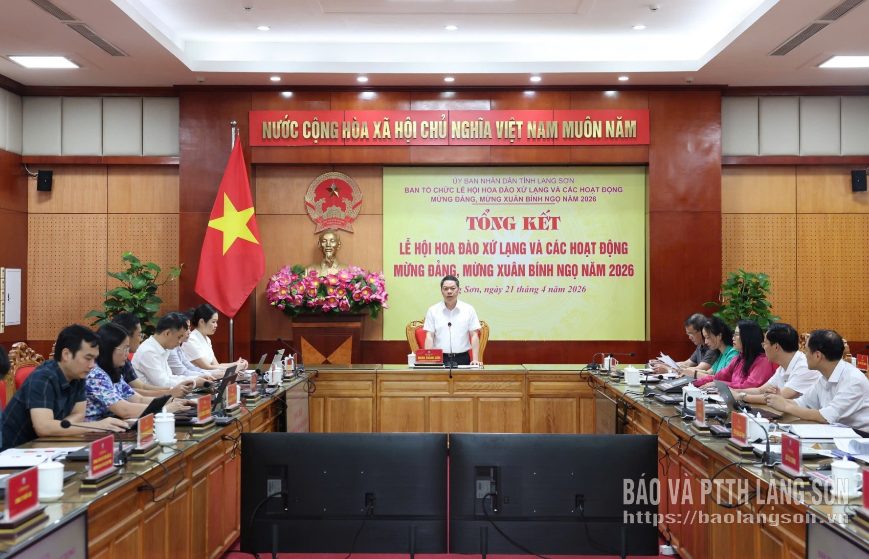 Đồng chí Đoàn Thanh Sơn, Phó Chủ tịch UBND tỉnh, Trưởng Ban Tổ chức Lễ hội Hoa Đào Xứ Lạng và các hoạt động mừng Đảng, mừng Xuân Bính Ngọ năm 2026 phát biểu kết luận cuộc họp