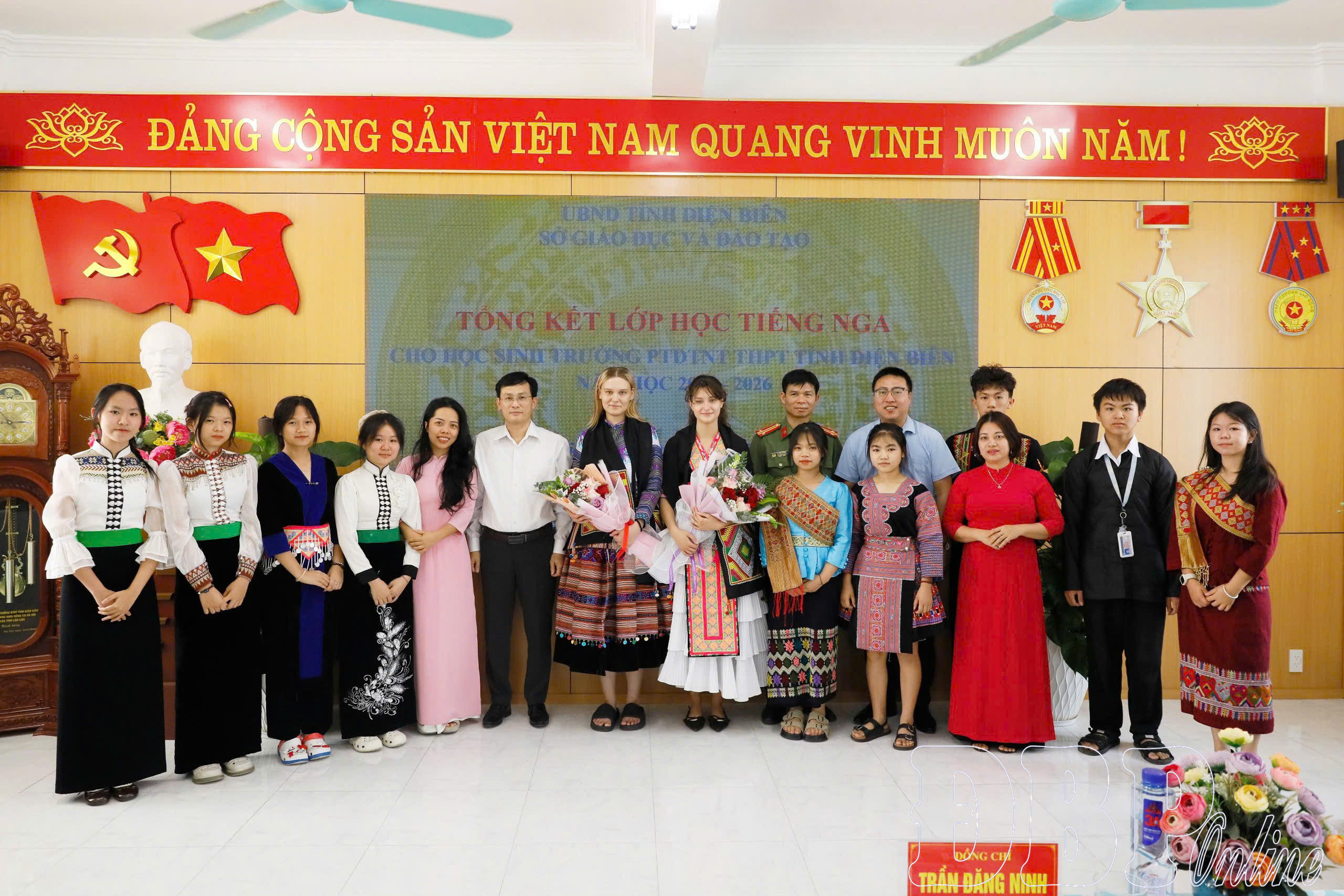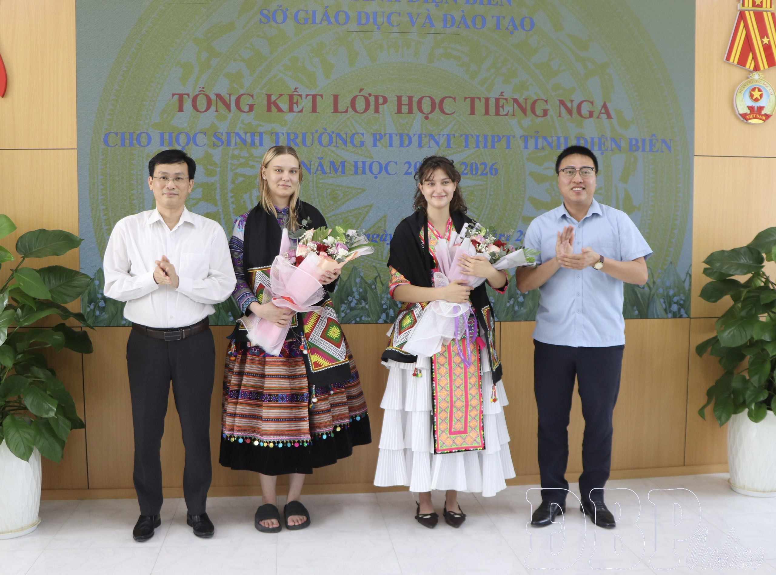 Lãnh đạo Sở Giáo dục và Đào tạo, Trường PTDTNT THPT tỉnh Điện Biên tặng hoa các giảng viên đến từ Liên bang Nga.