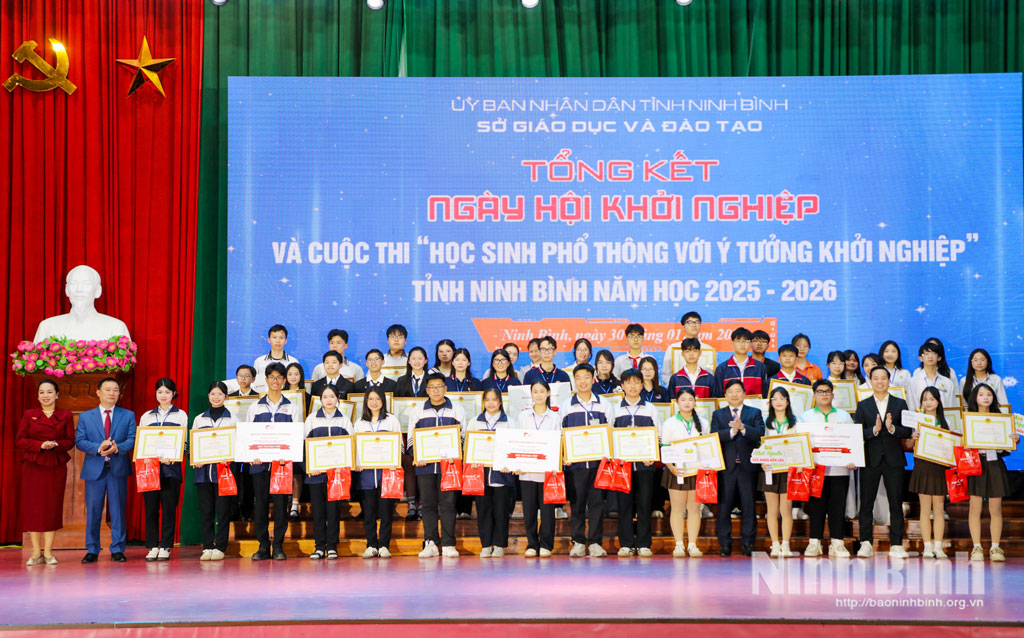 Đồng chí Nguyễn Tiến Dũng, Tỉnh ủy viên, Giám đốc Sở Giáo dục và Đào tạo tỉnh cùng đại diện các đơn vị trao giải Nhất cho các thí sinh tham dự Cuộc thi “Học sinh phổ thông với ý tưởng khởi nghiệp” tỉnh Ninh Bình, năm học 2025- 2026.