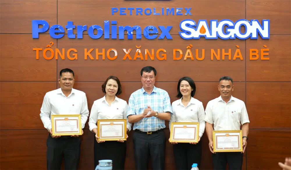 Bí thư Đảng ủy - Chủ tịch Petrolimex Sài Gòn Võ Văn Tân (giữa) trao Giấy khen tặng 04 đảng viên hoàn thành xuất sắc nhiệm vụ 05 năm liền, giai đoạn 2021 - 2025
