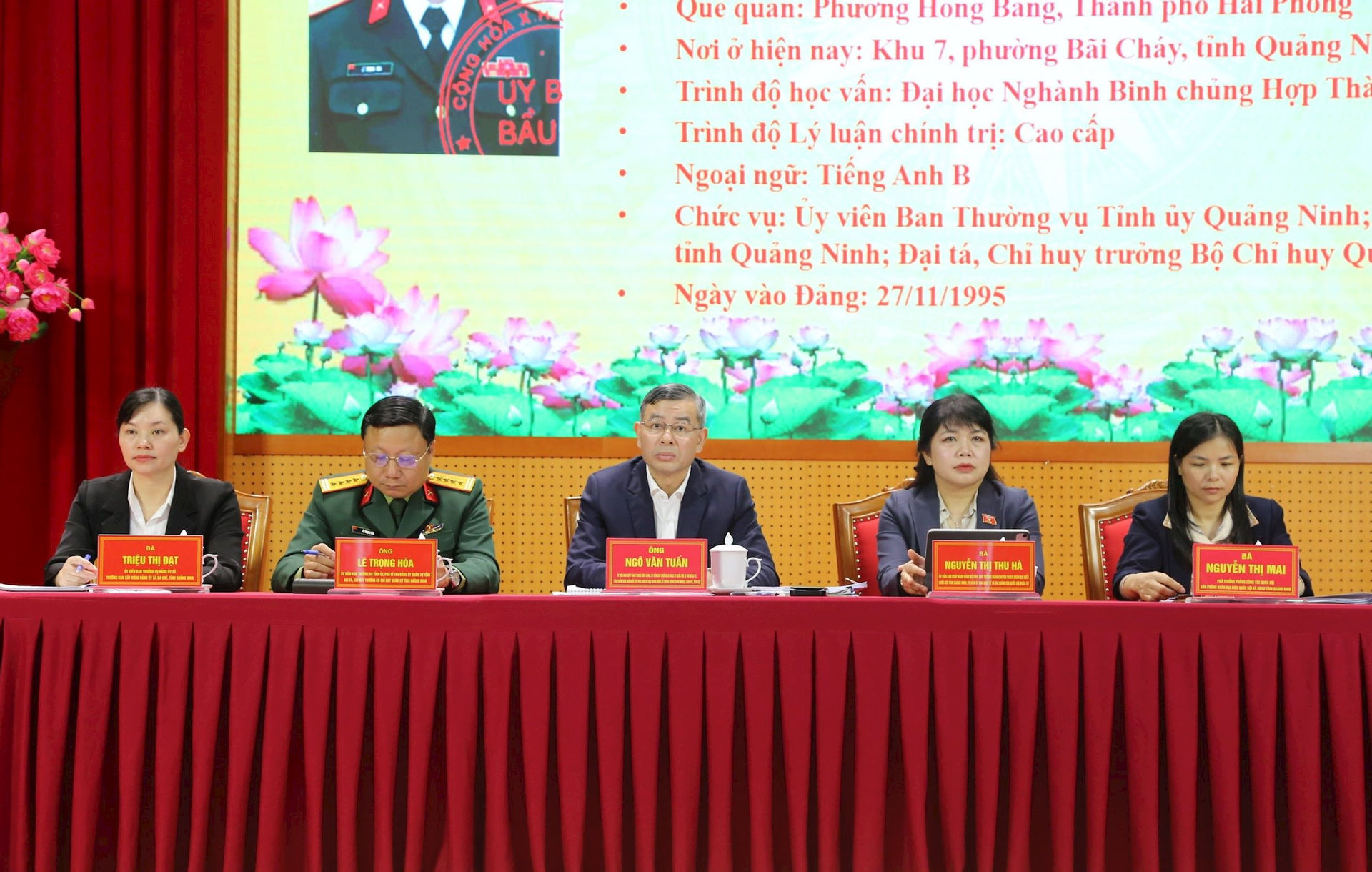 Tại Hội nghị, cử tri đã nghe giới thiệu tiểu sử tóm tắt và chương trình hành động của 5 ứng cử viên đại biểu Quốc hội khóa XVI, gồm các ông, bà: Ngô Văn Tuấn - Ủy viên Ban chấp hành Trung ương Đảng, Ủy viên Ban Thường vụ Đảng ủy Quốc hội, Chủ nhiệm Ủy ban Kiểm tra Đảng ủy Quốc hội; Bí thư Đảng ủy, Tổng Kiểm toán nhà nước; Ủy viên Ban chỉ đạo Trung ương về phòng, chống tham nhũng, lãng phí, tiêu cực; Lê Trọng Hòa - Ủy viên Ban Thường vụ Tỉnh ủy, Phó Bí thư Đảng ủy Quân sự tỉnh, Đại tá, Chỉ huy trưởng Bộ Chỉ huy Quân sự tỉnh Quảng Ninh; Nguyễn Thị Thu Hà - Ủy viên Ban Chấp hành Đảng bộ tỉnh, Phó Trưởng đoàn chuyên trách Đoàn đại biểu Quốc hội tỉnh Quảng Ninh, Ủy viên Ủy ban Kinh tế và Tài chính của Quốc hội; Nguyễn Thị Mai - Phó Trưởng Phòng Công tác Quốc hội, Văn phòng Đoàn đại biểu Quốc hội và HĐND tỉnh; Triệu Thị Đạt - Ủy viên Ban Thường vụ Đảng ủy, Trưởng Ban Xây dựng Đảng Đảng ủy xã Ba Chẽ.