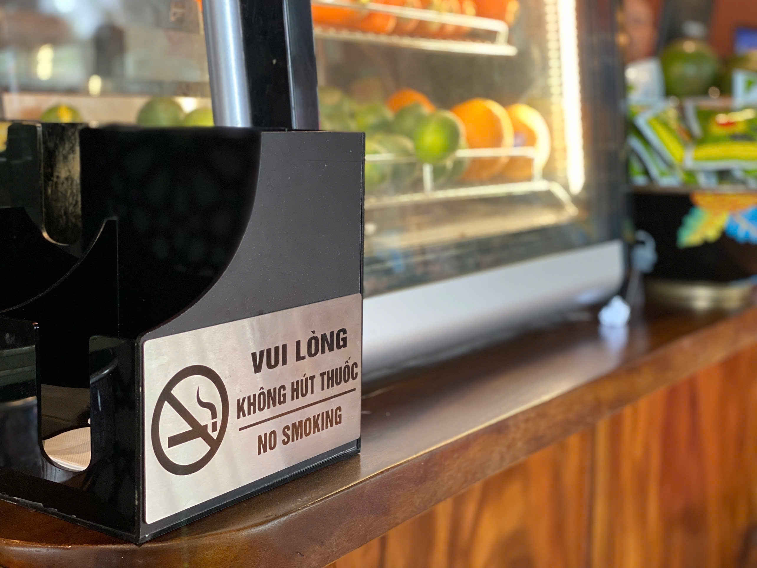 Bảng cấm hút thuốc tại quán cà phê xảy ra sự việc. Ảnh: Ánh Hoàng.