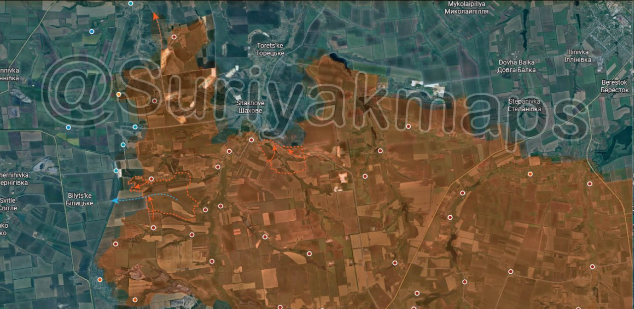 Ukraine bị cho là đã thất bại trong việc bao vây và chia cắt các nhóm quân Nga ở mặt trận phía bắc thành phố Pokrovsk. (mũi tên màu đỏ biểu thị bước tiến của Nga, màu xanh là hướng Ukraine rút lui). Ảnh: Suriyak/X.