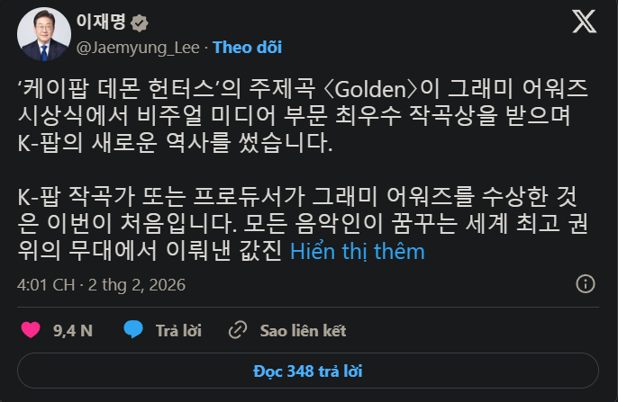 Ngày 2/2 (theo giờ Hàn Quốc), trên tài khoản X chính thức, Tổng thống Lee Jae Myung đã đăng tải thông điệp ca ngợi chiến thắng mang tính bước ngoặt của bài hát chủ đề trong bộ phim KPop Demon Hunters. Ông nhấn mạnh rằng “Golden” không chỉ là một ca khúc nhạc phim thành công, mà còn đánh dấu cột mốc chưa từng có của K-pop khi giành giải "Best Song Written for Visual Media’ at the Grammy Awards”-“Ca khúc hay nhất được viết cho phương tiện truyền thông hình ảnh” tại Grammy, sân chơi âm nhạc danh giá bậc nhất thế giới.