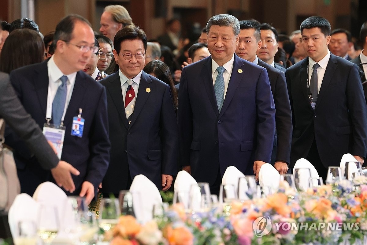 Tổng thống Hàn Quốc Lee Jae Myung và Chủ tịch Trung Quốc Tập Cận Bình tại bữa tiệc.