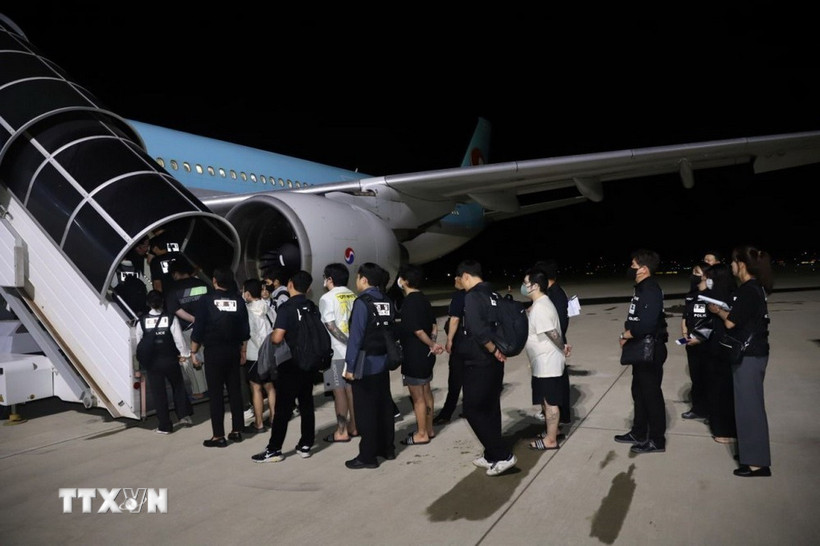 Các công dân Hàn Quốc liên quan hoạt động lừa đảo sử dụng công nghệ được bàn giao tại sân bay quốc tế ở thủ đô Phnom Penh, Vương quốc Campuchia, tối 17/10/2025. (Ảnh: AKP/TTXVN phát)