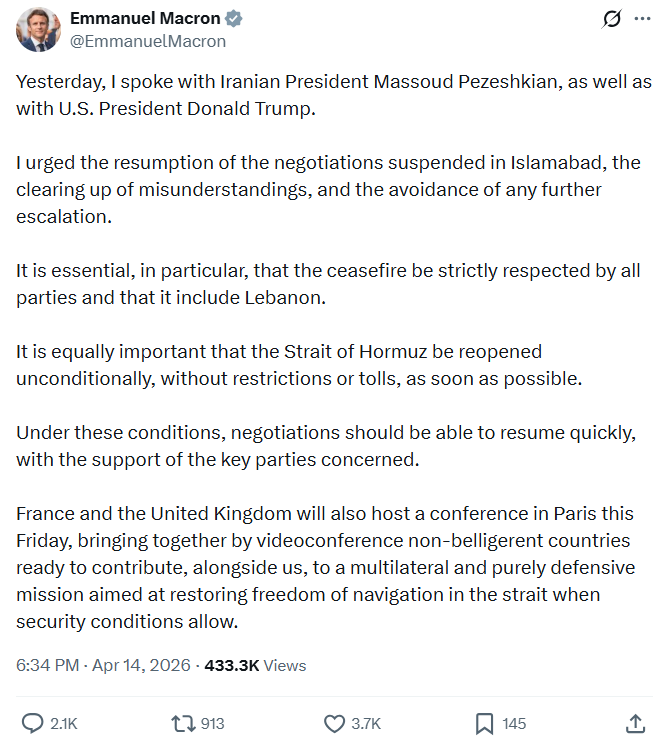 Trong thông điệp đăng trên mạng xã hội X, Tổng thống Macron nhấn mạnh, lệnh ngừng bắn cần được tất cả các bên tuân thủ nghiêm ngặt, đồng thời phải bao trùm cả tình hình tại Lebanon.