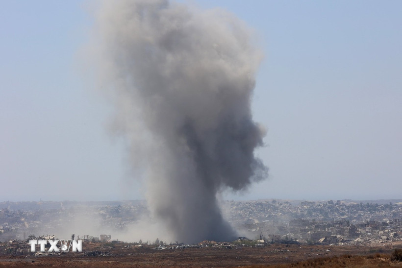 Khói bốc lên sau loạt không kích của Israel xuống Dải Gaza. (Nguồn: THX/TTXVN)