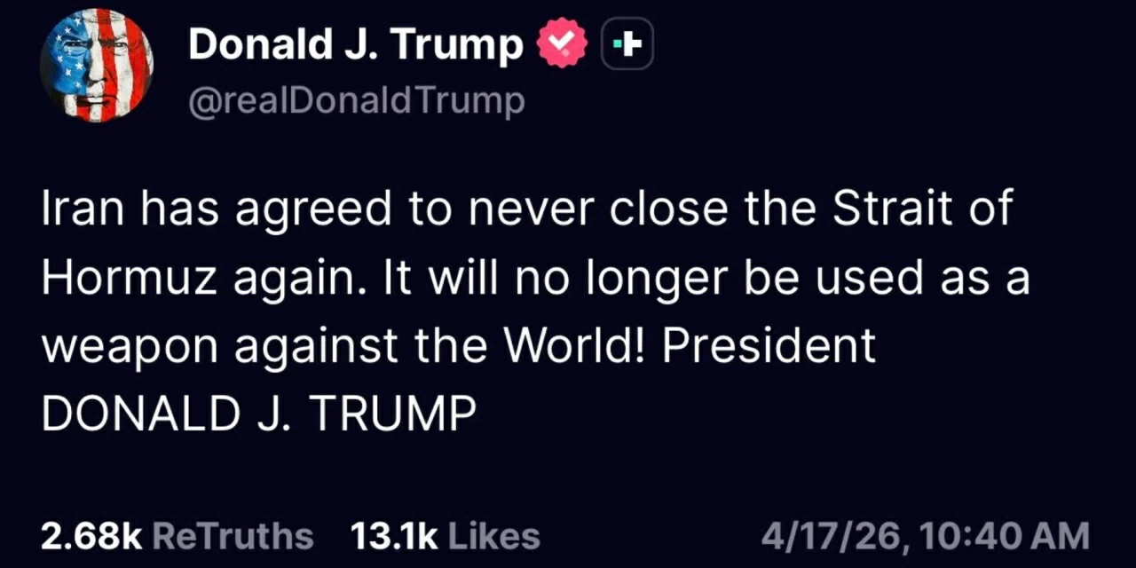 Trong bài đăng thứ 10 trên mạng xã hội Truth Social chỉ trong vòng một giờ, Tổng thống Mỹ Donald Trump chia sẻ: "Iran đã nhất trí sẽ không bao giờ phong tỏa eo biển Hormuz một lần nữa. Eo biển này sẽ không còn được sử dụng như một vũ khí chống lại thế giới".