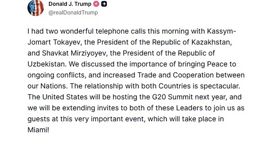 Tổng thống Donald Trump vừa công bố sẽ gửi lời mời Tổng thống Kazakhstan Kassym-Jomart Tokayev và Tổng thống Uzbekistan Shavkat Mirziyoyev tới Hội nghị G20 diễn ra tại Miami vào năm 2026, sau các cuộc điện đàm riêng rẽ với hai lãnh đạo. Thông điệp này thể hiện sự chú trọng ngày càng tăng của Washington vào Trung Á, nhấn mạnh các sáng kiến hòa bình, giải quyết xung đột và mở rộng hợp tác kinh tế trong khu vực giàu khoáng sản chiến lược. Trên mạng xã hội Truth Social, Trump mô tả quan hệ với cả hai quốc gia là “tuyệt vời”.