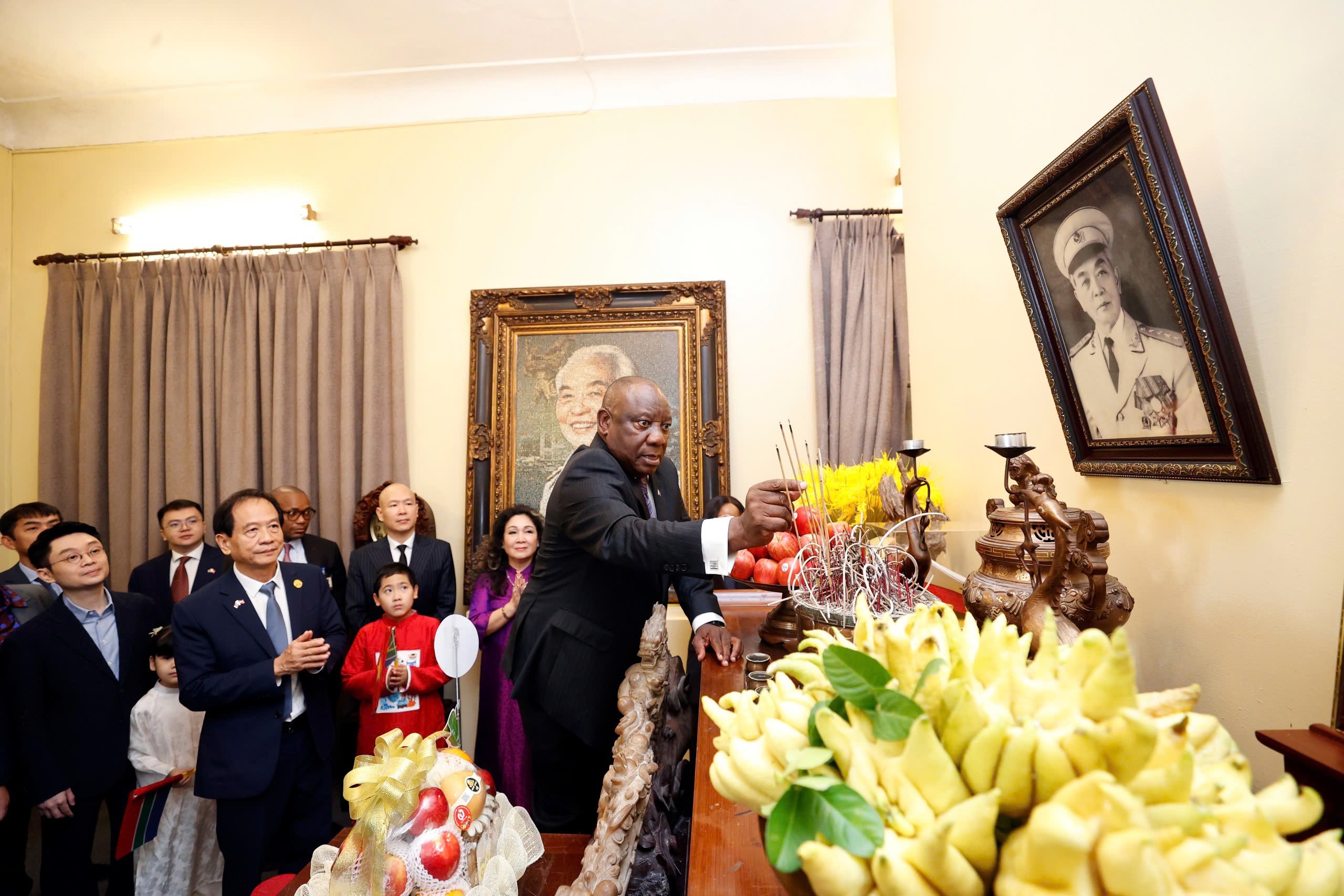 Tại đây, Tổng thống Matamela Cyril Ramaphosa cùng đoàn đại biểu cấp cao Nam Phi đã dâng hương, bày tỏ lòng thành kính và tri ân sâu sắc đối với Đại tướng Võ Nguyên Giáp – nguyên Ủy viên Bộ Chính trị, nguyên Bí thư Quân ủy Trung ương, nguyên Bộ trưởng Bộ Quốc phòng, Tổng Tư lệnh Quân đội nhân dân Việt Nam.