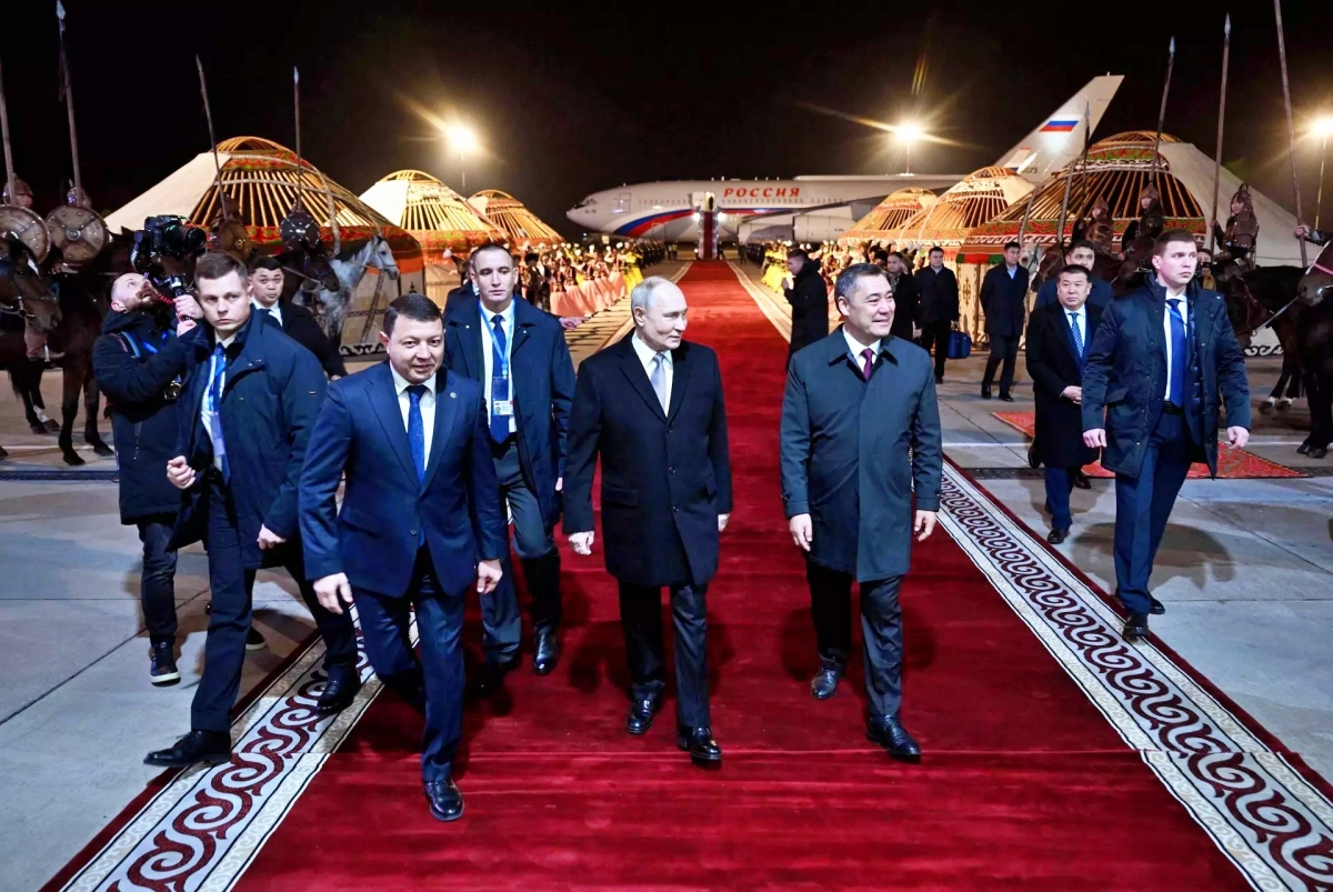 Ngay tại sân bay Manas, ông Putin đã được Tổng thống Kyrgyzstan - Sadyr Japarov đón tiếp trọng thể. Hai nhà lãnh đạo đã tới Quảng trường Chiến thắng và đặt vòng hoa tại Ngọn lửa Vĩnh cửu, dưới sự chứng kiến của đội nghi lễ quân sự trong nghi thức chào danh dự trang nghiêm.