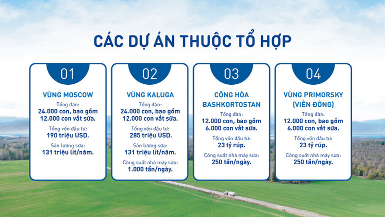 Ba trụ cột chính của chuỗi dự án TH tại Liên bang Nga hiện nay đều mang tầm vóc quốc gia. Tại tỉnh Kaluga, TH đã xây dựng tổ hợp trang trại bò sữa quy mô lớn kết hợp nhà máy chế biến sữa tươi sạch, ứng dụng công nghệ hiện đại của các nước tiên tiến như Đức, Thụy Điển, Israel… một trung tâm sản xuất sữa tươi hàng đầu của doanh nghiệp Việt Nam ở nước ngoài.