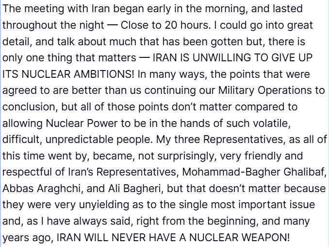 Theo kênh Al Jazeera, ông Trump viết: “Ở nhiều khía cạnh, những điểm đã được nhất trí tốt hơn so với việc Mỹ tiếp tục các hoạt động quân sự cho đến khi kết thúc, nhưng tất cả những điểm đó không quan trọng so với việc để năng lực hạt nhân nằm trong tay những người dễ biến động, khó đoán và khó lường như vậy”. Ông Trump cũng nhấn mạnh lại rằng Iran sẽ không bao giờ được có vũ khí hạt nhân.