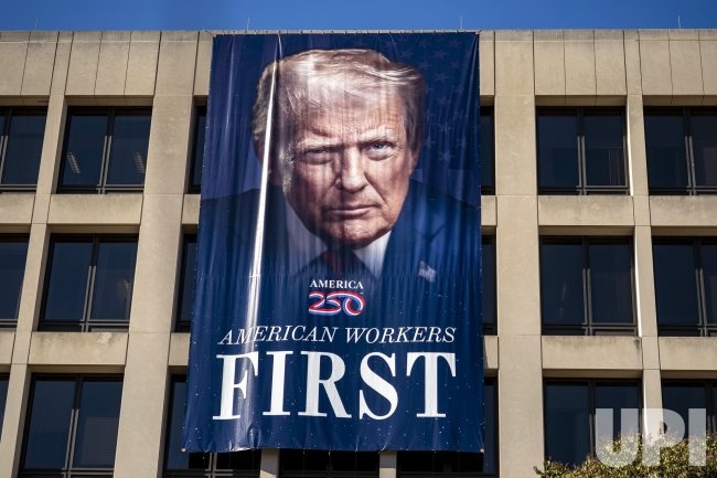 Bức ảnh Tổng thống Trump được treo trước trụ sở Bộ Lao động Mỹ tại Washington, DC vào tháng 8/2025. Ảnh: UPI.