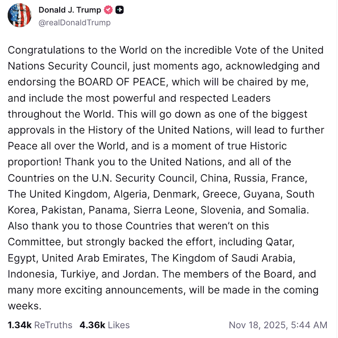 Trong tuyên bố đưa ra sau khi Hội đồng Bảo an Liên hợp quốc thông qua nghị quyết lịch sử về việc thành lập một lực lượng quốc tế tại Gaza nhằm khôi phục trật tự, bảo vệ dân thường, Tổng thống Mỹ Donald Trump cho rằng “đây sẽ được xem là một trong những quyết định phê chuẩn lớn nhất trong Lịch sử Liên hợp quốc, sẽ dẫn tới hòa bình hơn nữa trên toàn Thế giới, và là một khoảnh khắc mang ý nghĩa Lịch sử thật sự!” Ảnh chụp màn hình tài khoản mạng xã hội Truth Social của Tổng thống Mỹ Donald Trump