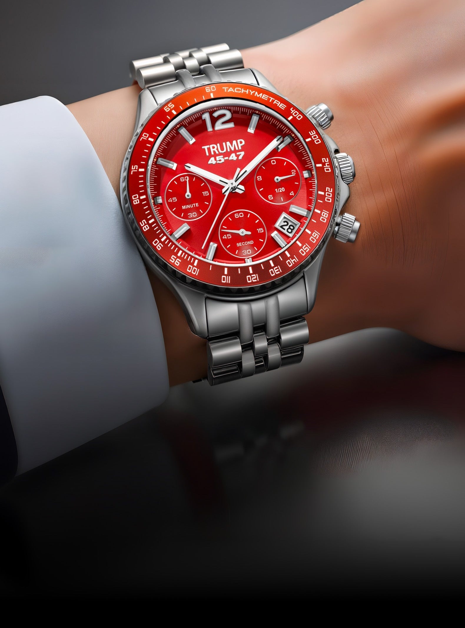 “Hãy nhìn chiếc đồng hồ đỏ tuyệt đẹp này, một trong những mẫu tôi yêu thích nhất. Hãy đeo nó thật tự hào, ai cũng sẽ biết nó đại diện cho ai và dành cho ai”, Trump nói trong đoạn quảng cáo, khi giới thiệu mẫu “Fight Fight Fight Chronograph Red” mới.