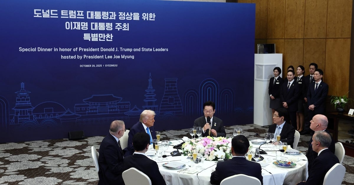 Trong bữa tiệc, ông Trump đánh giá cuộc gặp với nhà lãnh đạo Hàn Quốc là “tuyệt vời” và cho biết hai bên đã “gần như hoàn tất một thỏa thuận thương mại”.
