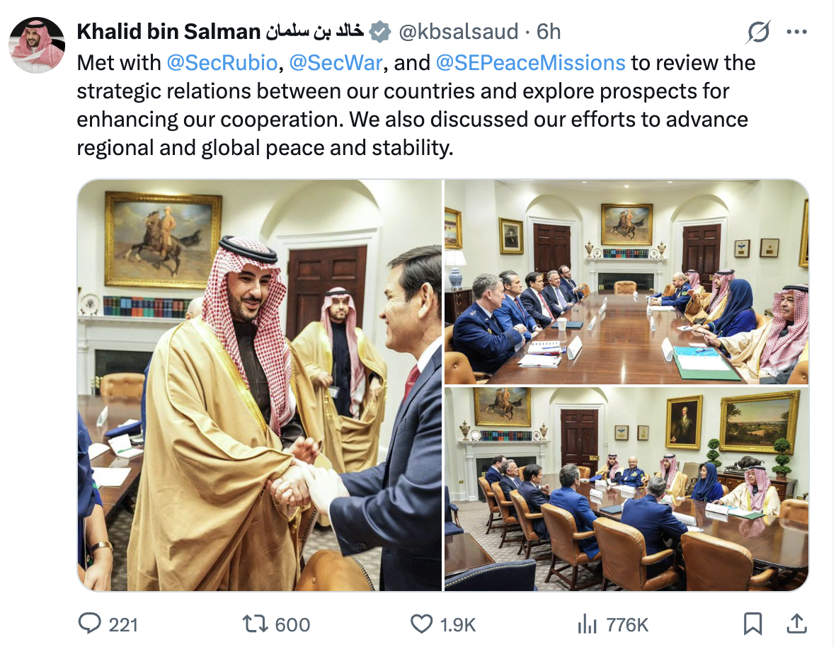 Cùng ngày, Bộ trưởng Quốc phòng Ả Rập Xê Út, Hoàng tử Khalid bin Salman, cho biết ông đã gặp Ngoại trưởng Mỹ Marco Rubio, Bộ trưởng Quốc phòng Pete Hegseth và đặc phái viên Mỹ Steve Witkoff tại Washington để rà soát quan hệ chiến lược song phương và thảo luận về các nỗ lực thúc đẩy hòa bình, ổn định khu vực và toàn cầu. Ả Rập Xê Út cũng tuyên bố sẽ không cho phép sử dụng không phận hay lãnh thổ nước này cho bất kỳ hành động quân sự nào nhằm vào Iran.