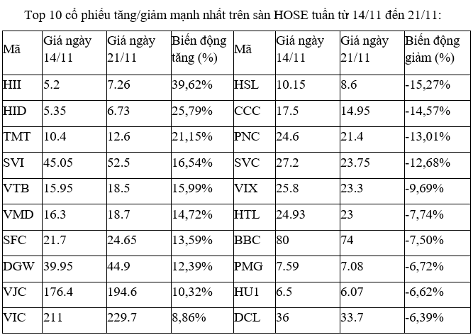 Các mã khác đáng chú ý là cặp đôi bluechip VJC và VIC, dù mức tăng chỉ trên dưới 10%, nhưng là động lực tích cực cho VN-Index. Trong đó, cổ phiếu VJC chỉ còn cách mức đỉnh thiết lập trong phiên 30/10 không xa. Đối với VIC thì tiếp tục ghi nhận mức đỉnh lịch sử mới.