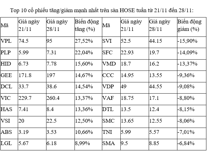 Trên sàn HOSE, tuần qua vẫn là cổ phiếu VIC góp mặt. Đây là tuần thứ hai liên tiếp mã này góp mặt trong số những cổ phiếu tăng cao nhất sàn và biên độ tăng cao hơn khi tuần trước chỉ nhích gần 9%.
