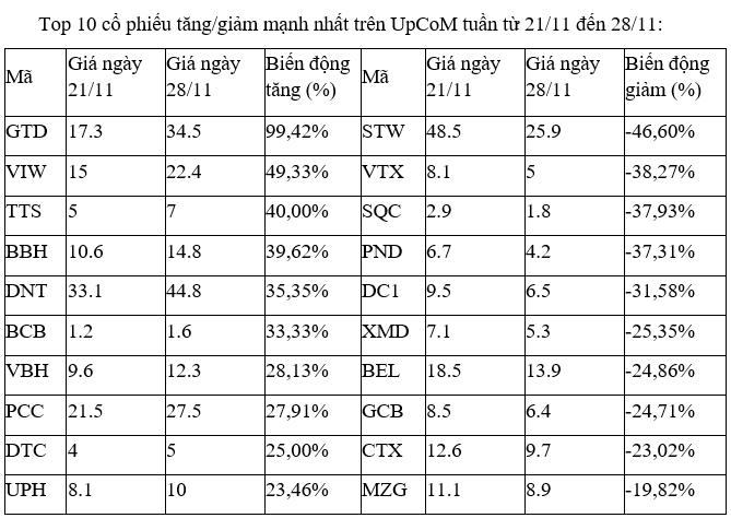 Trên UpCoM, cổ phiếu GTD của CTCP Giầy Thượng Đình dẫn đầu đà đi lên và bỏ xa phần còn lại khi tăng tới gần 100%. Tổng cộng, cổ phiếu GTD đã có tám phiên liên tiếp tăng kịch trần. Mặc dù vậy, thanh khoản lại èo uột khi chỉ khớp lệnh phần lớn 100, 200 đơn vị/phiên.