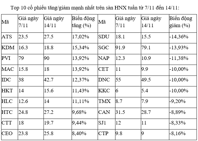 Ở chiều ngược lại, lực cung giá thấp được tiết giảm, nên các cổ phiếu chỉ mất 5-10%. Trong đó, ICT bị chốt lời sau khi tuần trước là quán quân tăng giá trên sàn với mức tăng gần 33%.