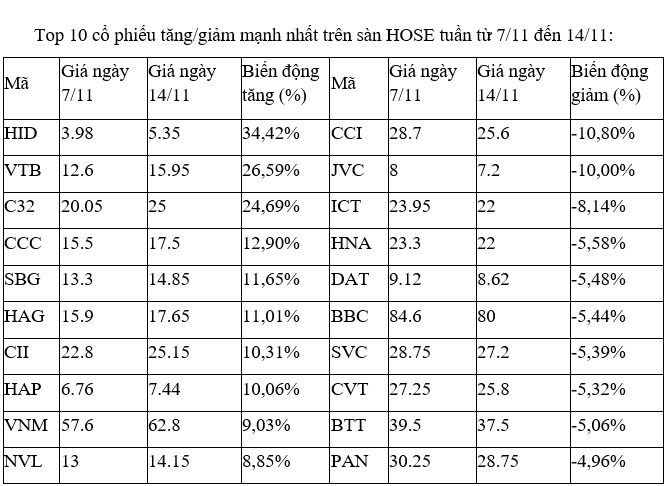 Trên sàn HOSE, nhóm các cổ phiếu tăng tốt nhất đa phần là các mã vừa và nhỏ, phản ánh một phần dòng tiền đầu cơ đang có xu hướng tìm kiếm cơ hội ngắn hạn T+, với sự góp mặt của HID, HAG, VTB, HAP, C32…