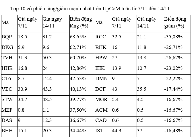 Trên UpCoM, tân binh gần đây là BQP của CTCP Nhựa Chất lượng cao Bình Thuận bất ngờ có tuần tăng mạnh, duy trì 7 phiên liên tiếp từ ngày có phiên giao dịch đầu tiên là 05/11 đến 13/11, trước khi giảm nhẹ trong phiên cuối tuần 14/11.