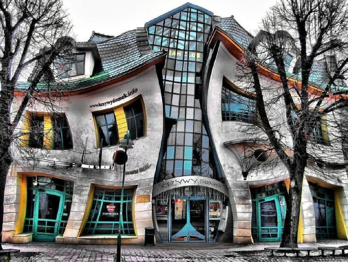 Ngôi nhà “xiêu vẹo” tại Sopot, Ba Lan hoàn thành vào năm 2003 và nhanh chóng trở thành điểm nhấn kiến trúc của thành phố biển này. Thiết kế công trình lấy cảm hứng từ những bức tranh minh họa giàu tính tưởng tượng của họa sĩ Jan Marcin Szancer cùng phong cách hội họa của họa sĩ Per Dahlberg. Sự kết hợp này tạo nên công trình kiến trúc độc đáo và bất cứ ai khi đặt chân đến đây cũng đều cảm tưởng như mình đang bị ảo giác.