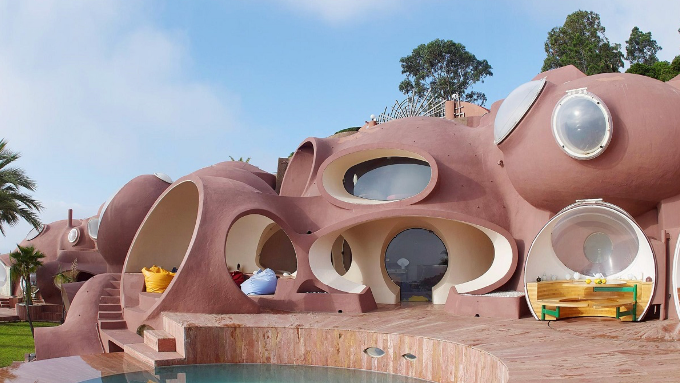 Ngôi nhà bong bóng tại Pháp là tác phẩm tiêu biểu của Antti Lovag, kiến trúc sư tiên phong theo đuổi kết cấu bê tông cốt thép mang tính thử nghiệm. Lấy cảm hứng từ hình khối và đường nét tự nhiên, ông tạo nên công trình phá vỡ chuẩn mực kiến trúc truyền thống. Với vị trí tuyệt vời nằm ngay cạnh vịnh biển, khu nhà được xây dựng với diện tích 1.200 m².
