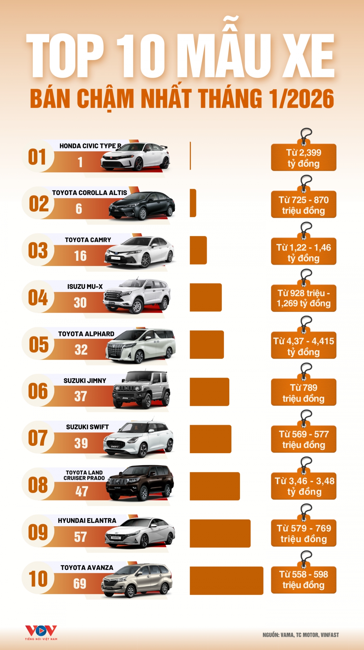 Top 10 mẫu xe bán chậm nhất tháng 1/2026: Lộ diện nhiều gương mặt mới