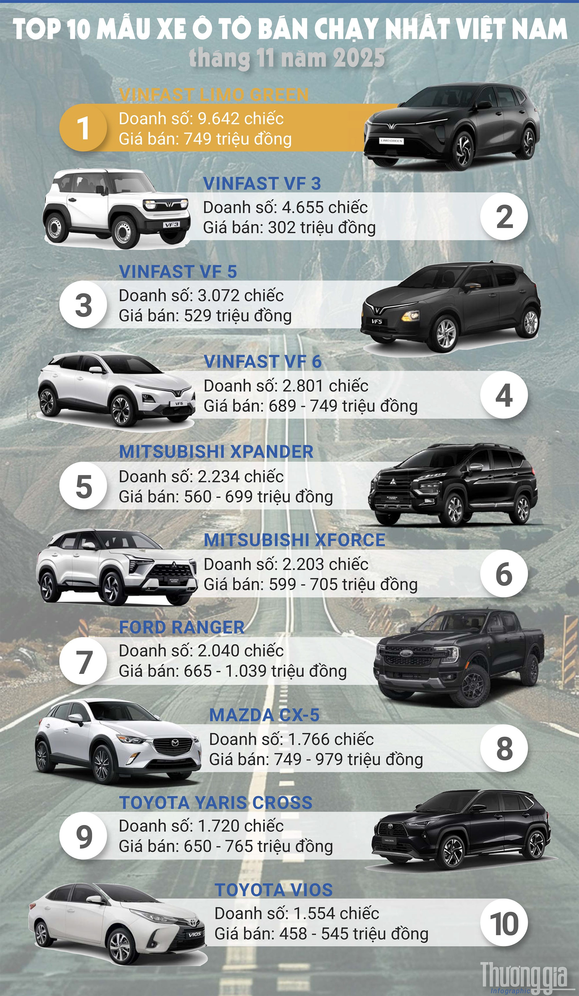 Mẫu SUV mini VF 3 của VinFast cùng với VF 5 là 2 dòng xe liên tục giúp cho doanh số của hãng xe thương hiệu Việt duy trì đà tăng trưởng mạnh mẽ khi cả 2 cùng chia nhau dẫn đầu đến 7 tháng. Kể từ khi hãng dừng chính sách thuê pin, mức giá hấp dẫn chỉ 302 triệu đồng (đã bao gồm pin) giúp mẫu VF 3 ngày càng phổ biến, được kỳ vọng trở thành “xe quốc dân” mới của người Việt Nam.